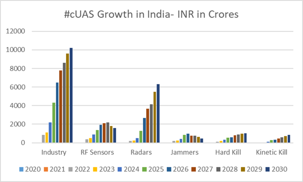 The current conflict in Ukraine has emerged as one of the biggest example as to how the technology can be repurposed to gain asymmetric advantage in the theatre of war, or so to say, alter the theatre itself. After their use in the Nagorno Karabach conflict and thereafter in the Aramco Attack and now in Ukraine-Russia War, the drones are seemingly becoming the biggest subject of intrigue. More than their legacy ISR roles their importance in the front lines has been felt in all together a different role. The use of commonly available commercial drones to deliver explosive payloads with near surgical precision in great numbers has nearly altered the perception about this threat vector. The ease of use, proliferation of the tech and the costs economics of rigging the drones for nefarious intent is both worrisome and an incentive for radical thinking in the development of the countermeasures. Gone are the days when even the most benign drone sightings can ever be ignored, if you see a drone in your part of the sky and cannot identify to be your own, the disaster could just be behind the corner; today, the adversary has capability to deliver artillery fire with exact precision and also enjoy the first person view of the harm they can inflict with help of small low cost drones, which we would have earlier brushed as toys! The moot question that now haunts every defence practitioner, is their inadequacy to counter this fast emerging aerial threat, which is getting away almost unchallenged; we have seen the simplest of the tech deployed in the famous low costs Shaheds is overwhelming the defences like never before. Most of us are ready to lose our sleep at the first reference of anything called swarm, however, the Robust all powerful Anti Drone solution seems to elude almost all of the governments across the globe.The art of countering the drone threats or the #cUAS is emerging as a whole new discipline and largely a work in progress. Most of the Antidrone solutions available in yester years were largely repurposed EW solutions; till the time the drone was dependent on the Pilot control, it was easy to Jam the control signals and force the drone to Return to the base, land at the location or hover for a while. With the capability to negate the GNSS navigational aids, even the autonomous UAVs could be somehow countered, however things are not same with the advent of 3G/4G/LTE and now 5G. The Counter Drone industry in India is quite young and most of the counter measures have so far been focussing on the Jammers. Though the jammers have been so far doing a great job, the newer generation of the drones have been successful to go past the barrier and conclude their missions. We have seen that the complex Air Defence complexes have themselves been targeted using the jammer location as the navigation tool! Even though these trends are very alarming and the threat vector gains strength from the fact that the newer navigation controls based in 3G/4G/5G band are both difficult to detect and jam, with the use of Inertial Navigation tools like Lidars and Optical Guidance make Jamming, Spoofing and Protocol Manipulation are seemingly losing their teeth. It must not otherwise mean that there are no real solutions against the drone attacks, the ones other than the jammers are not that simple nor so cheap and thus less common. In the above infographic, the Jammers shown in Red and the GPS/GNSS denial shown in pink, the advanced counter drone systems use Directed Energy weapons (DEW) like lasers shown in Yellow and HPM devices shown in Skyblue. Till the time these DEW tools like lasers and High Power Microwaves become affordable and easily available, their dominance in the counter UAS strategy is still quite a distant option. These Hard Kill options are currently both experimental and bulky, their use in the real theatres of war is quite promising, however, these weapons cannot be deployed in the urban spaces and during the peace time. When this deadly trouble is falling freely from the skies, and this asymmetric warfare needs to be contained somehow, the soldier on the ground can always deploy the weapons they have in hand, we have seen successful attempts to bring down the Pakistani drones by our own BSF, those sharp shooters are doing a good job. Giving them long range guns along with digital targeting aids shall be a good option. Use of missiles is another commonly counter attack practice, being reported in several battle zones. The missiles and rockets are both expensive and a very scarce resource, though these do become a primary tool, when the adversary has launched a frontal attack using bigger military drones, in the civilian space, the ballistics are not a preferred option, you need to match the response according to the size and the enormity of the threats. Recently the lasers emerged to be seen as the most promising, our very own DRDO has successfully deployed the laser weapons in the D4 system and it seems to be just a matter of time, when the bigger, yet deadlier version Kali5000 could be the game changer. The HPM-High Power Microwave option had so far suffered on account of their bulky format, lower power and operational ranges and very high cost. The announcements from another US based innovator Epirus puts their HPM unit-Leonidas amongst the most desired Anti-Drone tools. The “DroneCatchers” as these specialised drones are now being popularly called fill up the gap between the “Soft Kill” space, occupied by the Jammers and Spoofers and the “Hard Kill” options like Rockets, Missiles, Ballistics, Lasers and soon to come High Power Microwave devices. Day time PTZ cameras have evolved as an effective drone tracking tool but their use in autonomous drone detection is still circumspect due to the limitations with the technology and environmental conditions in several parts of North India. Despite their high costs, the